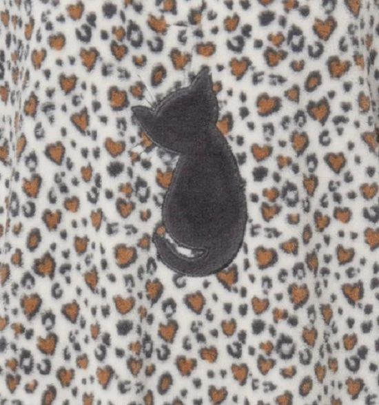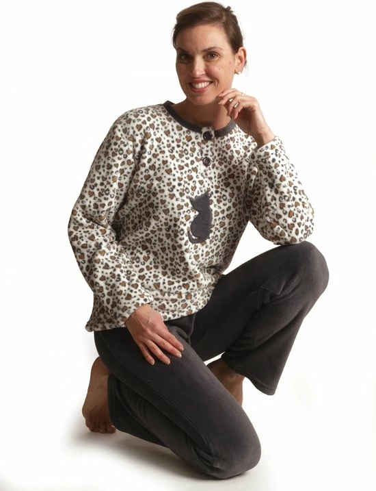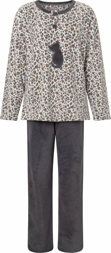 Heerlijk zacht en warm dames huispak. Het shirt heeft een speelse all-over print, een paar knoopjes bij de hals en een uni kat detail voorop. Deze kleur komt terug in de uni broek.