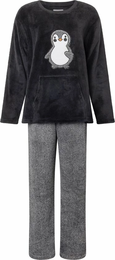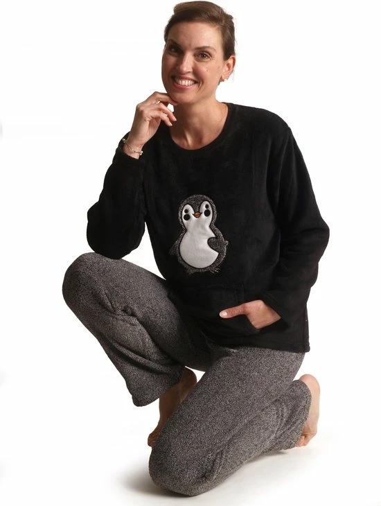 Heerlijk zacht en warm dames huispak. Het huispak heeft een speelse mêlee print voorop, een ronde hals en een heerlijke steekzak om de handen in te warmen. De kleur van de print komt terug in de mêlee broek. Heerlijk warm en wollig voor ’s avonds op de bank of in het vrije weekend.