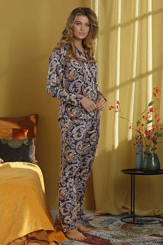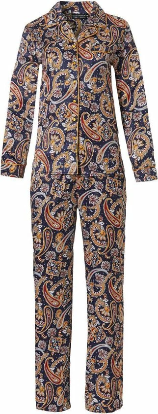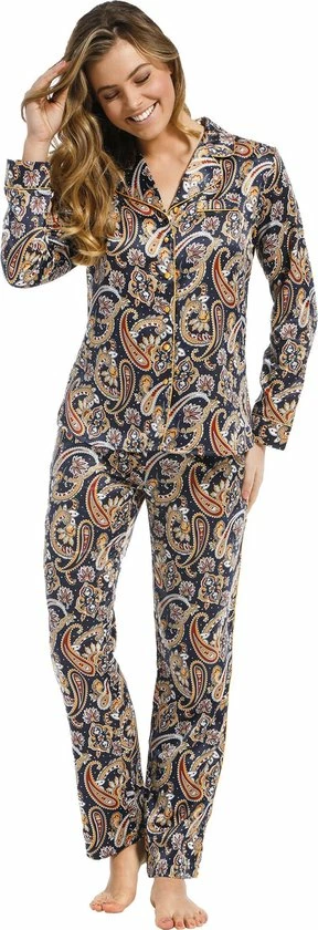 Satijnen dames doorknoop pyjama met mooie print uit de Pastunette De Luxe serie. 83% polyester en 17% katoen. Maten vallen klein uit, bij twijfel maatje groter nemen.