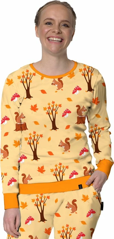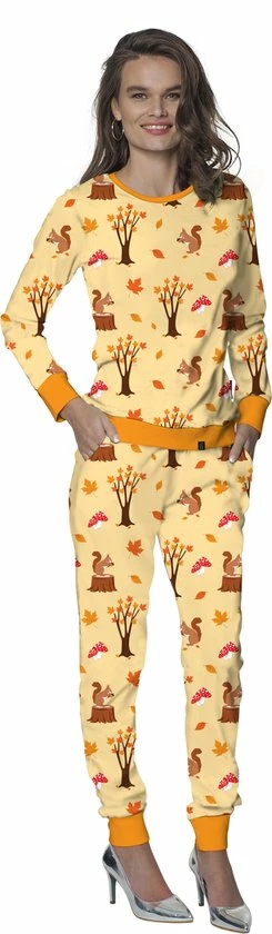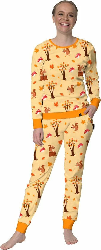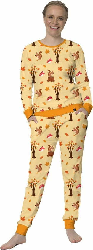 Neem tijd voor jezelf en ontspan in deze katoenen damespyjama. Een dames pyjama set met shirt en pyjamabroek, verkrijgbaar in vele maten! Herfstprints met o.a. herfstbladeren, eekhoorns en paddestoelen.
