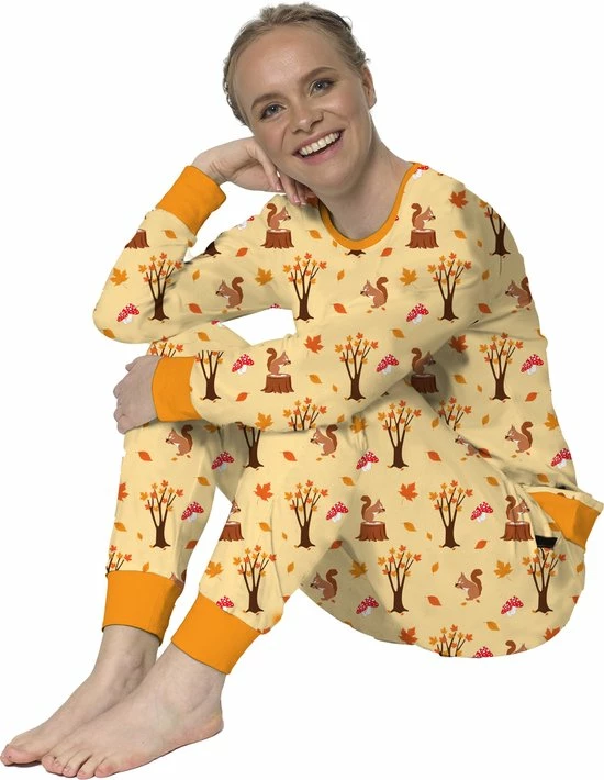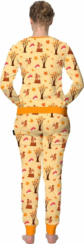 Neem tijd voor jezelf en ontspan in deze katoenen damespyjama. Een dames pyjama set met shirt en pyjamabroek, verkrijgbaar in vele maten! Herfstprints met o.a. herfstbladeren, eekhoorns en paddestoelen.
