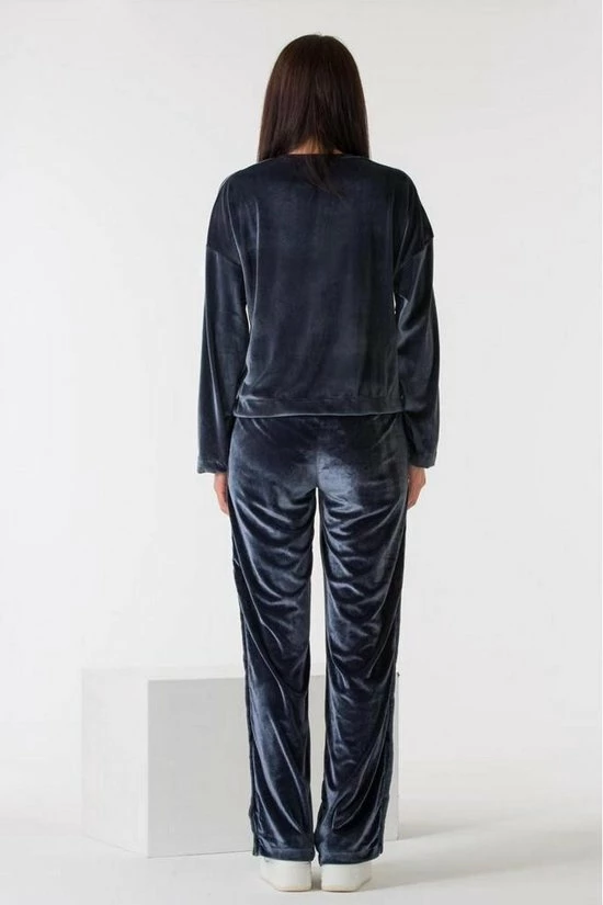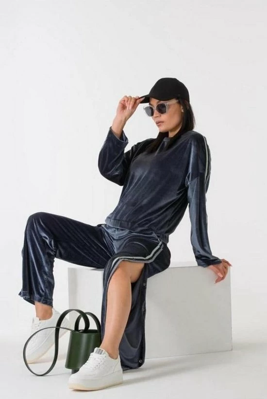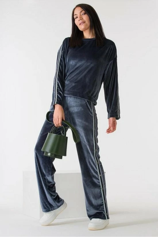 Vrijetijdspak van superzachte stof, steekzakken en wijde pijpen.