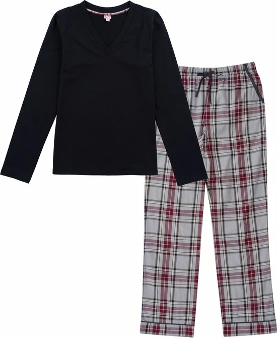 Dames pyjama van het merk La V. De top heeft lange mouwen met een V- hals. De Flanel broek heeft een geruit patroon en is voorzien van een elastische tailleband en aan beide zijkanten steekzakken. De set is gemaakt van een katoenmix en heeft lichte trech in de stof. Je voelt duidelijk dat het een kwalitatieve stof is.