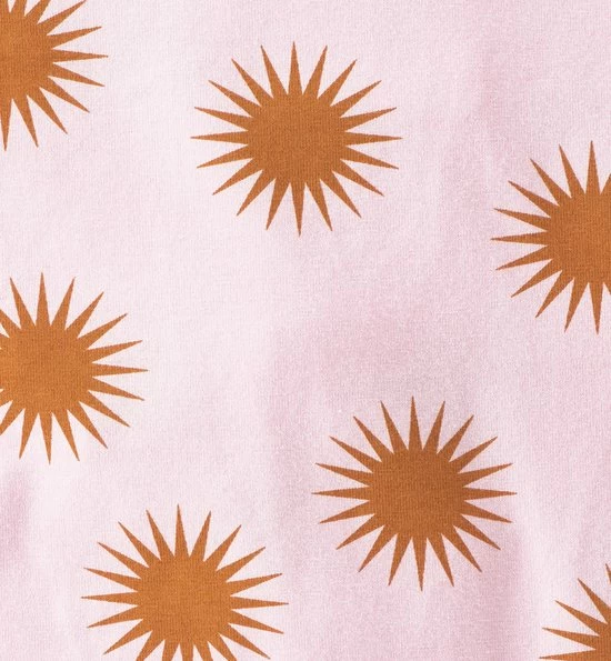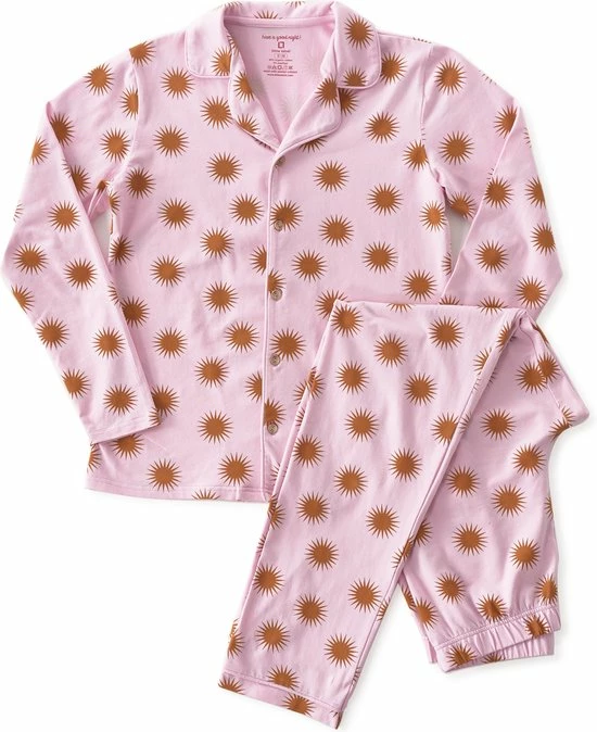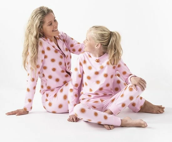 Nieuw bij Little Label nachtmode voor dames! Een heerlijke roze pyjama-set in grandad style gemaakt van elastische zachte organic katoen (jersey). Het shirt met houten knoopjes en de broek met elastische taille, zijn gemaakt van onze zachtste katoen. Liitle Label damespyjama. Mooie zonnen-print.