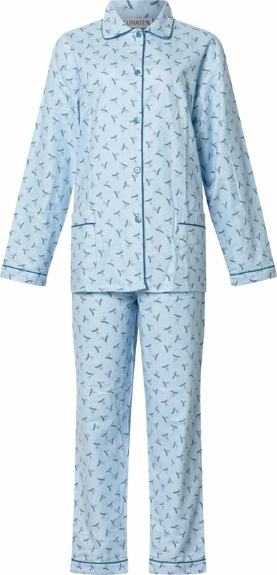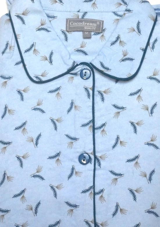 Flanellen dames pyjama met een all-over print van het merk Cocodream, gemaakt van 100% Katoen. Het pyjama jasje heeft lange mouwen afgewerkt met een boord, knoopssluiting, zakken en een kraagje. De Pyjama broek is afgewerkt met een elastische stoffen band en de pijpen zijn omgezoomd. De pyjama voelt superzacht aan en zit lekker warm in de koude winternachten.