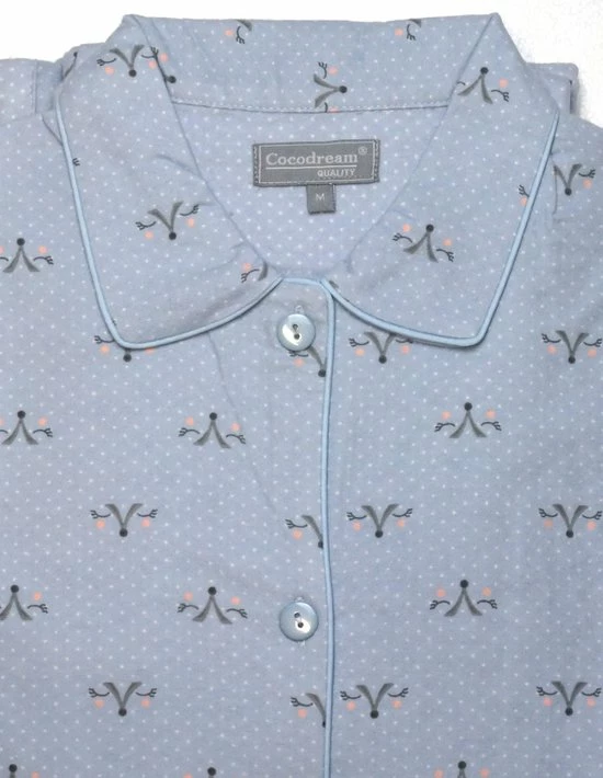 Flanellen dames pyjama met een all-over print van het merk Cocodream, gemaakt van 100% Katoen. Het pyjama jasje heeft lange mouwen afgewerkt met een boord, knoopssluiting, zakken en een kraagje. De Pyjama broek is afgewerkt met een elastische stoffen band en de pijpen zijn omgezoomd. De pyjama voelt superzacht aan en zit lekker warm in de koude winternachten.
