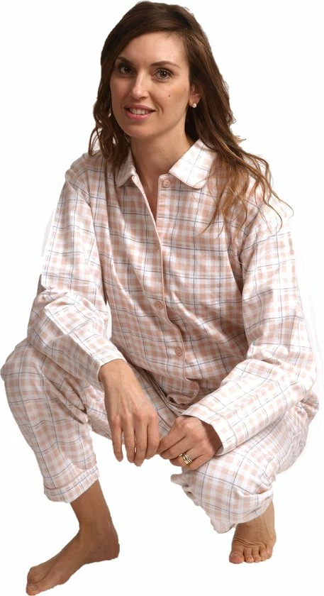Flanellen dames pyjama met een all-over print van het merk Lunatex, gemaakt van 100% Katoen. Het pyjama jasje heeft lange mouwen afgewerkt met een boord, knoopssluiting, zakken en een kraagje. De Pyjama broek is afgewerkt met een elastische stoffen band en de pijpen zijn omgezoomd. De pyjama voelt superzacht aan en zit lekker warm in de koude winternachten.