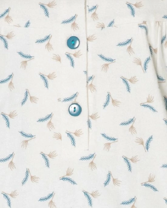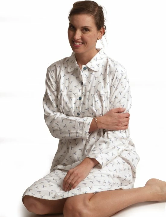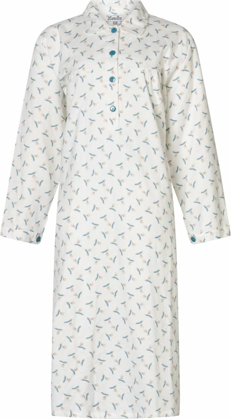 Mooi flanellen dames nachthemd met lange mouw. Netjes afgewerkt met een kraagje en knoopjes bij de hals. Door het geruwde katoen heerlijk warm om te dragen. Het nachthemd heeft een neutrale maar toch leuke all-over print.