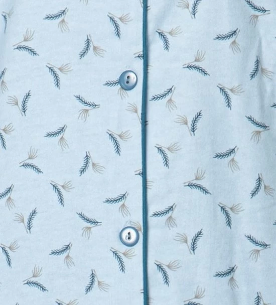 Mooie flanellen dames pyjama met lange mouw. Het jasje is geheel doorknoop en is netjes afgewerkt met een kraag en zakken. Door het geruwde katoen heerlijk warm om te dragen. De pyjama heeft een frisse maar toch vrij neutrale print.