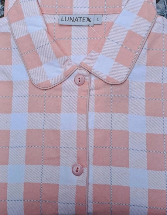 Let op: dit betreft de zalm ruit variant zoals de detail foto. Het model is hetzelfde als de Lunatex dames pyjama Ruit grijsblauw.