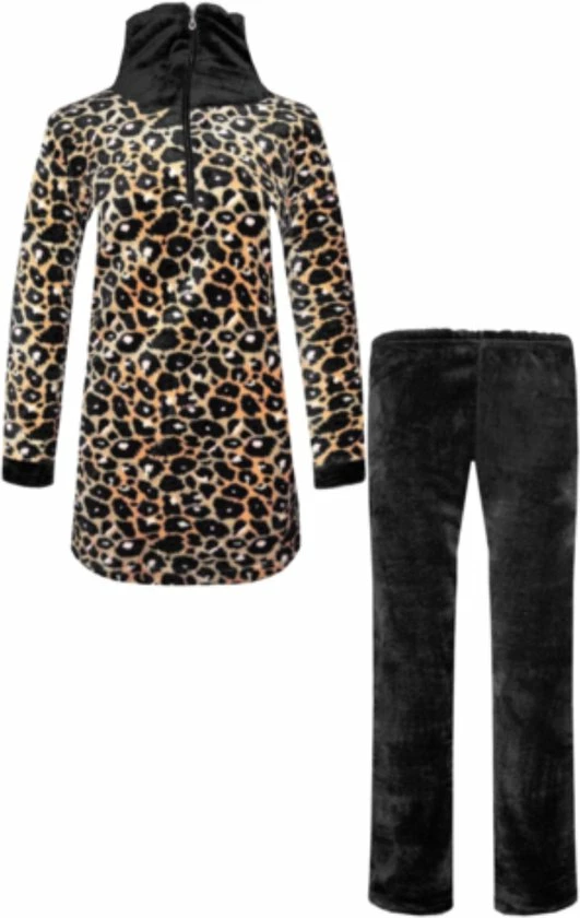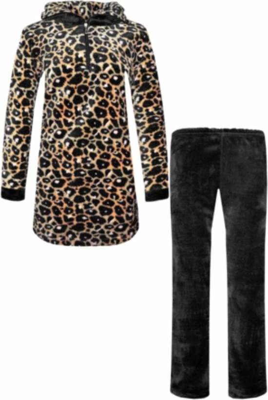 Een heerlijk zachte ruime fleece huispak met panterprint en een ritsje met capuchon. De huispak is warm en draagt licht. Het vest is voorzien van twee opgestikte zakken. Het materiaal is van 100% polyester. wasbaar op 40 graden.