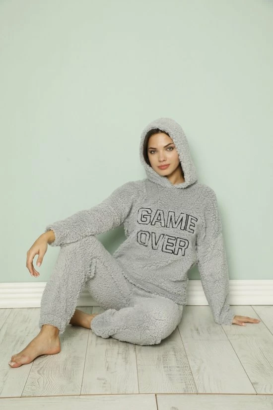 Deze teddy stof pyjama set met capuchon is ongelooflijk warm, superzacht om aan te raken en heeft een relaxed fit. Kortom, alle eigenschappen om het ultieme comfort te ervaren tijdens het koude winter dagen! Ook staat er een leuke tekst erop: “Game Over”