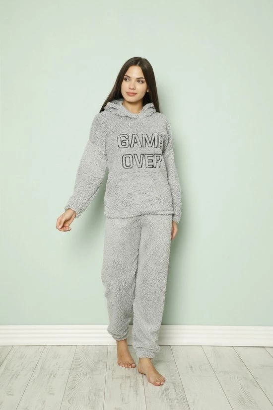 Deze teddy stof pyjama set met capuchon is ongelooflijk warm, superzacht om aan te raken en heeft een relaxed fit. Kortom, alle eigenschappen om het ultieme comfort te ervaren tijdens het koude winter dagen! Ook staat er een leuke tekst erop: “Game Over”