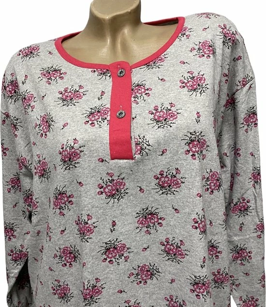Een hele mooie pyjamaset met bloemenprint van flanel. De pyjamaset draagt warm en comfortabel. De top heeft een ronde hals met knoopsluiting en lange mouwen. De pyjambroek heeft een elastieke tailleband. Het materiaal is van 100% katoen. Wasbaar op 40 graden.