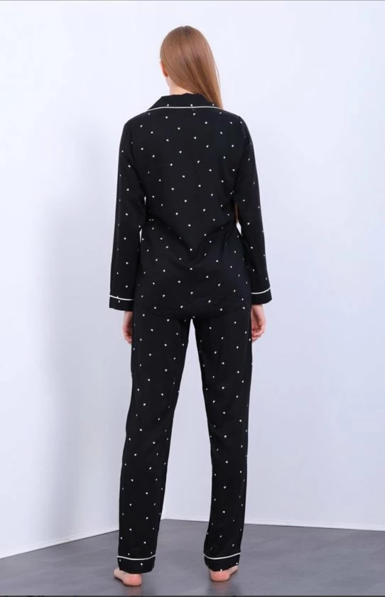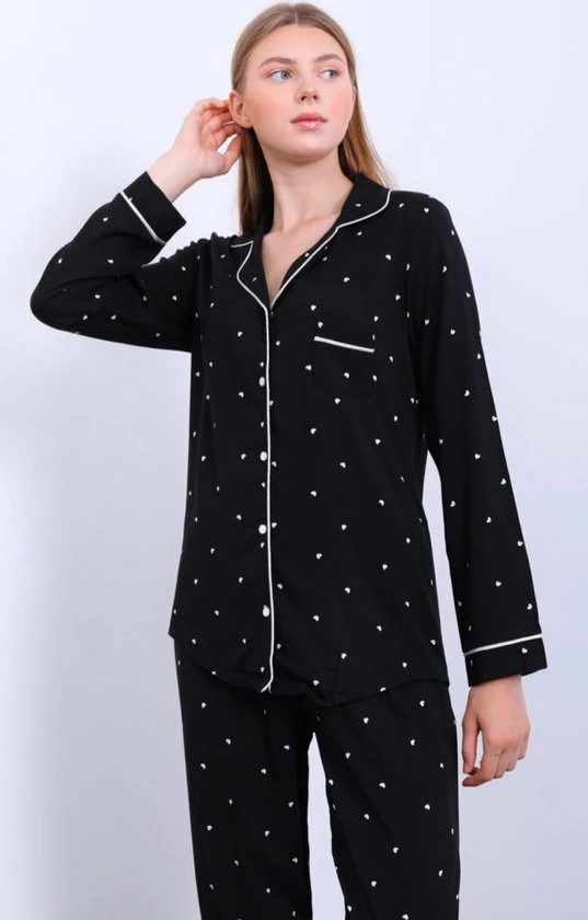 Merkloos Katoen-Satijn Dames Pyjamaset Zwart Met Hartjes Maat M