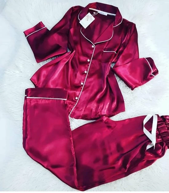 Prachtige satijnen pyjama set met een kraag, een knoopsluiting voor, lange mouwen en een borstzak. Rechte belijning aan de onderkant. Het zeer zachte satijn voelt heel zacht en licht aan op de huid