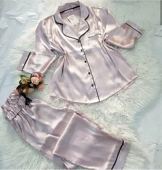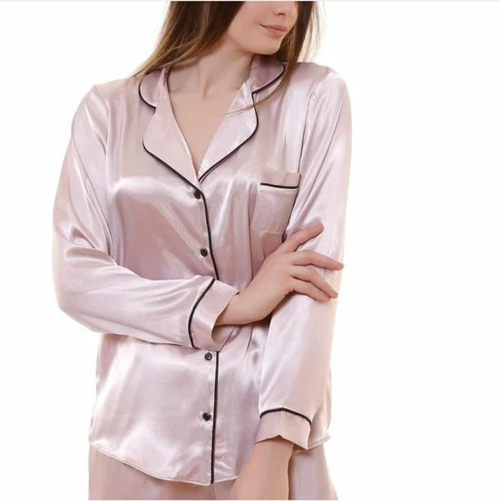 Prachtige satijnen pyjama set met een kraag, een knoopsluiting voor, lange mouwen en een borstzak. Rechte belijning aan de onderkant. Het zeer zachte satijn voelt heel zacht en licht aan op de huid