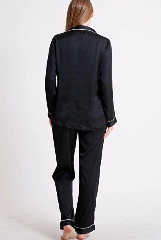 Prachtige satijnen pyjama set met een kraag, een knoopsluiting voor, lange mouwen en een borstzak. Rechte belijning aan de onderkant. Het zeer zachte satijn voelt heel zacht en licht aan op de huid