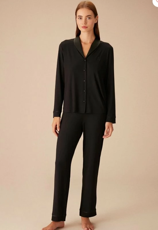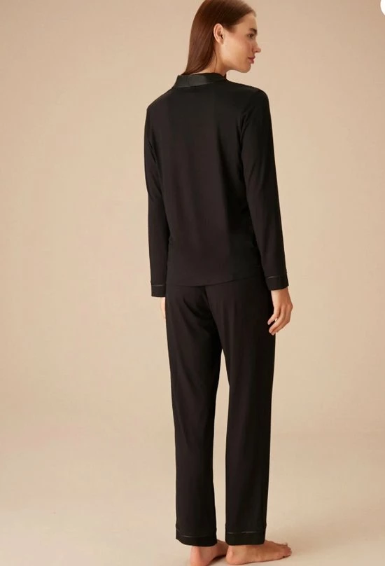 comfortabele pyjamabroek en zwarte biesdetails op kraag, mouw en beendetails.