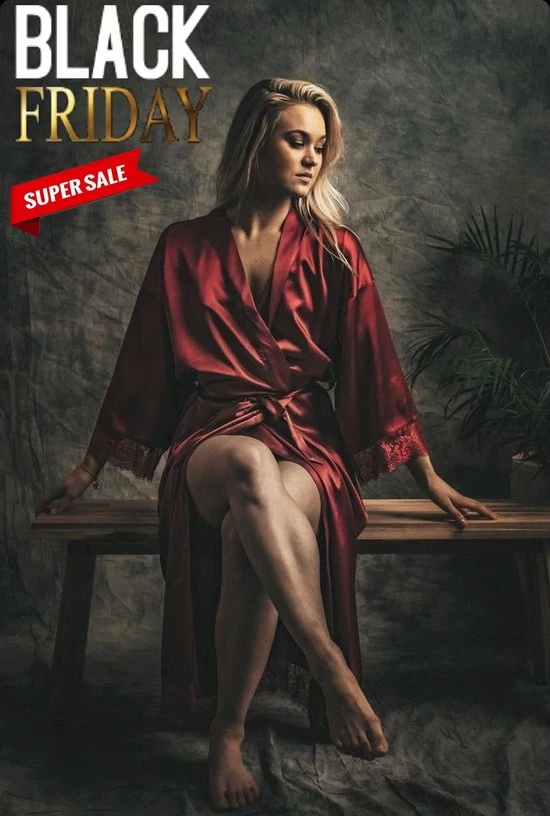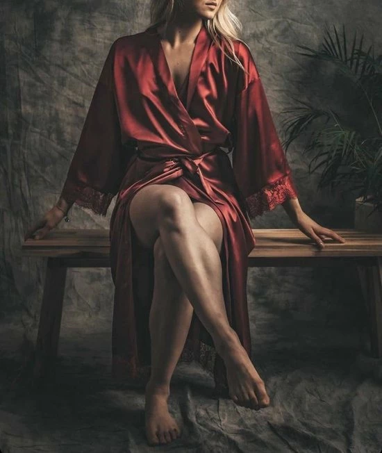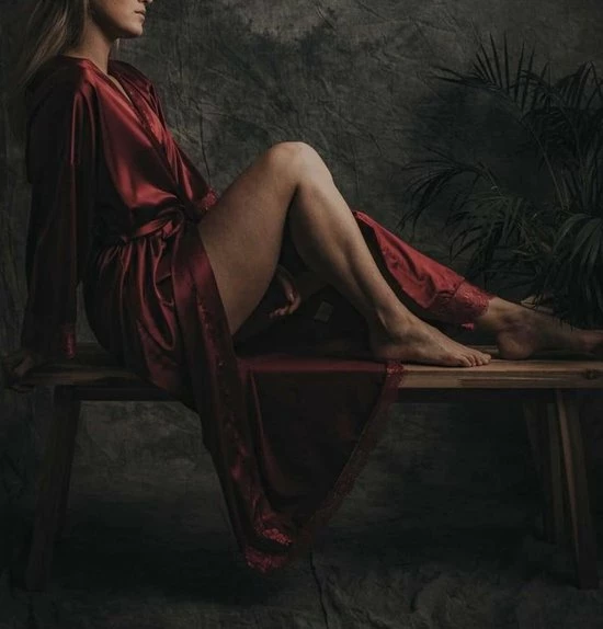 Bordeaux rood kleurige kimono van satijn met kant en lange mouw.