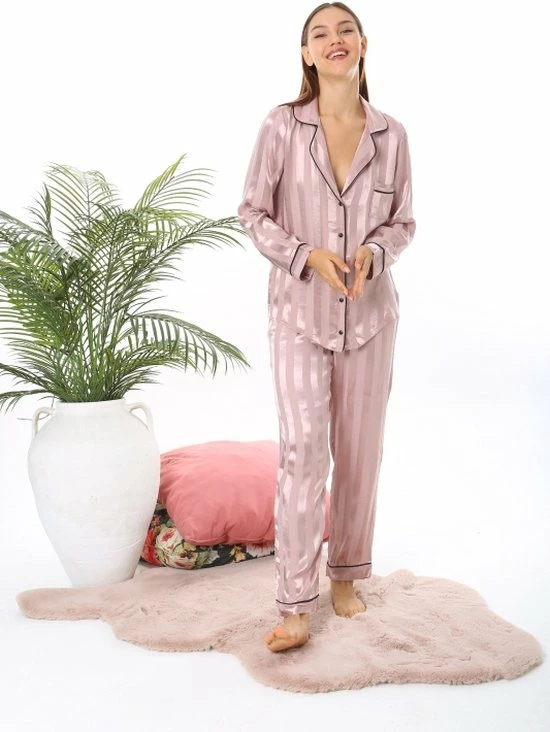 Prachtige viscose pyjama set met een kraag, een knoopsluiting voor, lange mouwen en een borstzak. Rechte belijning aan de onderkant. Het zeer zachte stof voelt heel zacht en licht aan op de huid