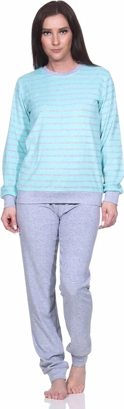 Badstof dames pyjama met blauw of groen jasje beide met grijs melee broek. Top van 70% katoen en 30% polyester. Broek 52% katoen en 48% polyester. Afgewerkt met elastische boorden.