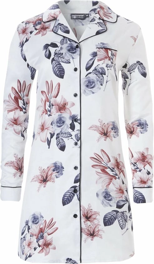 Stijlvol satijnen doorknoop nachthemd van Pastunette Deluxe. Dit ecru nachthemd heeft een mooi all over bloemmotief en is voorzien van een borstzakje. De binnenkant van het nachthemd voelt heerlijk zacht aan draagt daardoor erg comfortabel.