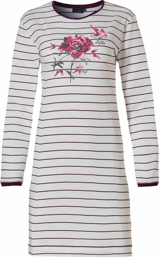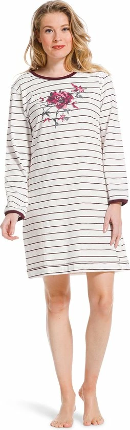 Dit witte nachthemd van Pastunette komt uit de serie Rose Tones. Het is wit met een donker rood streepje en is bedrukt met een roos. Het nachthemd heeft een ronde donkerrode hals en lange mouwen.