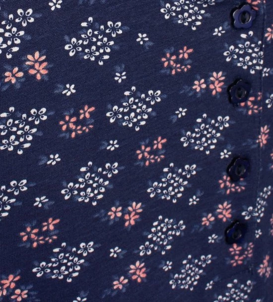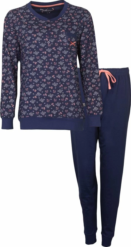 Tenderness Dames Pyjama gemaakt van 100% katoen. Deze pyjama is gemaakt in een draagbare en rekbare jersey kwaliteit. Deze pyjama is speciaal voor Pyjamaonline ontworpen. De top heeft een mooi geprint bloemetjes dessin. De top heeft aan de zoom een boord, lange mouwen met unie boorden, een ronde hals met polosluiting en een opgestikt borstzakje met een satijnen strikje erop. De lange unie broek in de taille een aantrekkoord voor meer draagcomfort en boorden aan de enkels. Boorden aan de mouwen en enkels zijn afgewerkt met elasthan voor een betere pasvorm.