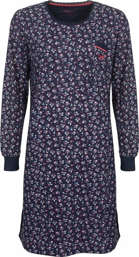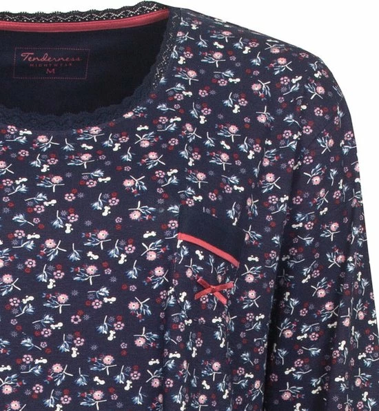 Tenderness dames nachthemd gemaakt van 100 % gekamde katoen. Dit nachthemd is gemaakt in een draagbare en rekbare jersey kwaliteit. Dit nachthemd is geprint in een mooi bloemetjes dessin. Dit nachthemd heeft Lange mouwen met unie rekbare boorden voor meer draag comfort, ook heeft dit nachthemd een Ronde hals afgewerkt met kant en op de borst een opgestikt zakje met een Roze satijnen strikje erop. De lengte van dit nachthemd is 95 cm.