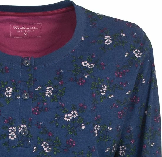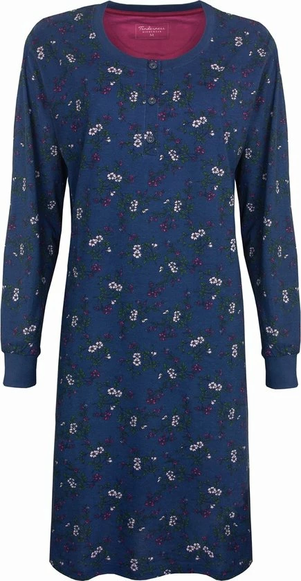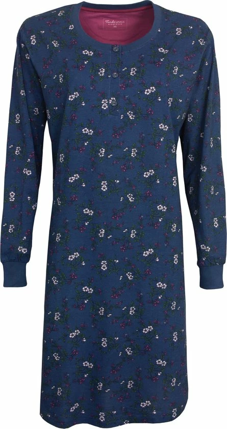 Tenderness dames nachthemd gemaakt van 100 % gekamde katoen. Dit nachthemd is gemaakt in een draagbare en rekbare jersey kwaliteit. Dit nachthemd heeft een mooi geheel bloemetjes dessin. Dit nachthemd heeft Lange mouwen met rekbare boorden en heeft een Ronde hals met polo sluiting . Ook heeft dit nachthemd op de borst een mooie bloemetjes print. De lengte van dit nachthemd is 95 cm.