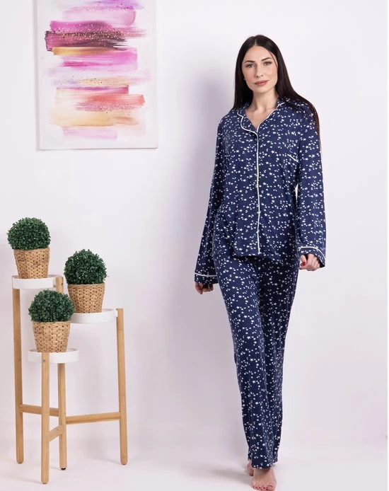 De sterrenprint maakt deze prachtige pyjama opvallend! Deze pyjama met lange mouwen en lange broek voor dames is heerlijk zacht van viscose waardoor het zowel mooi als comfortabel is. De pyjama is donkerblauw en heeft een all over sterrenprint. De top met zijn iets wijdere silhouet, een aangename reverskraag en een afgeronde zoom biedt u veel bewegingsvrijheid. Fantastische Vanilla pyjama om in te dromen!