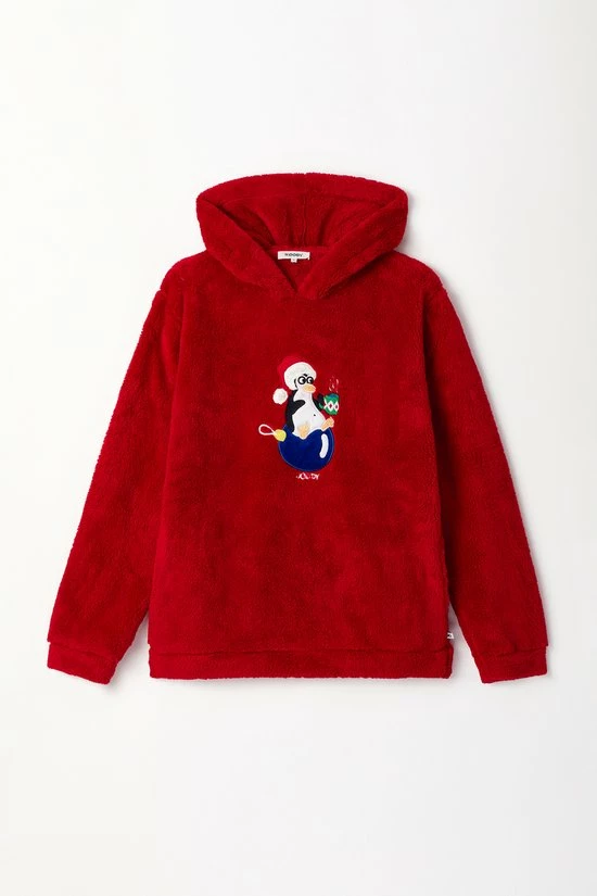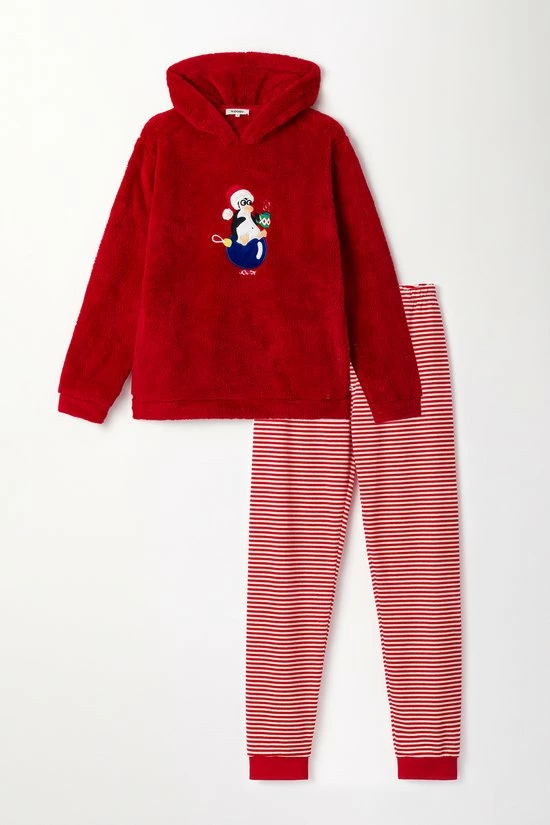 Rode teddy pyjama voor kinderen en volwassenen van Woody. De rode teddy sweater met kap heeft vooraan een pinguin op een grote kerstbal. De veloure sponsen broek is rood en ecru gestreept.